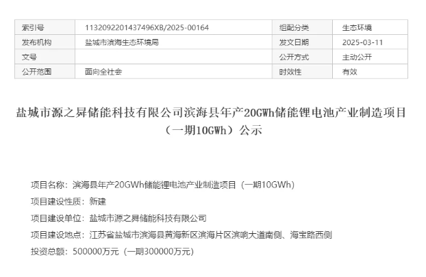 近日,江苏滨海县人民政府发布盐城市源之曻储能科技有限公司滨海县年产20GWh储能锂电池产业制造项目(一期10GWh)公示。