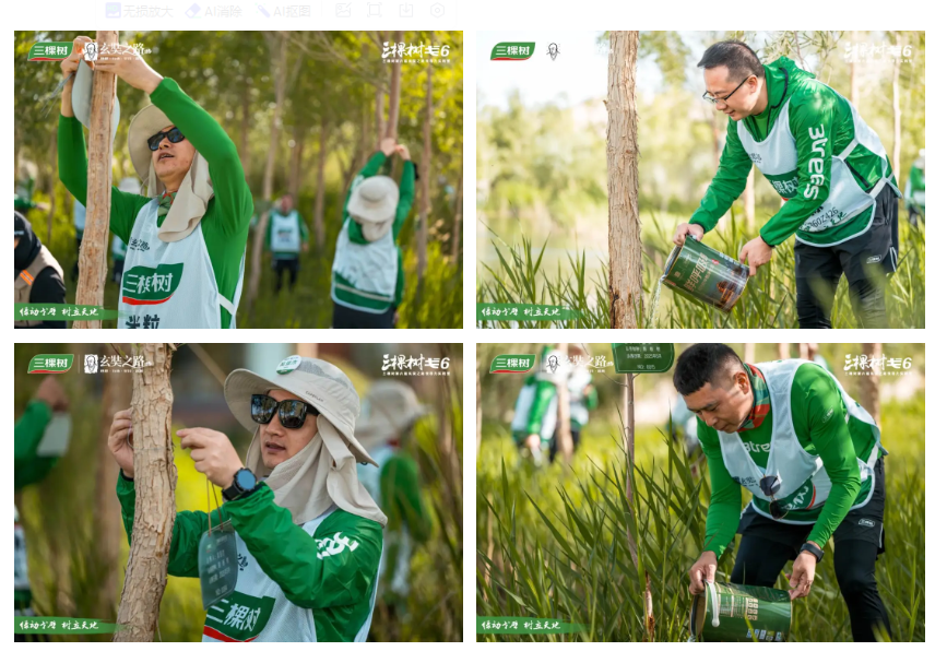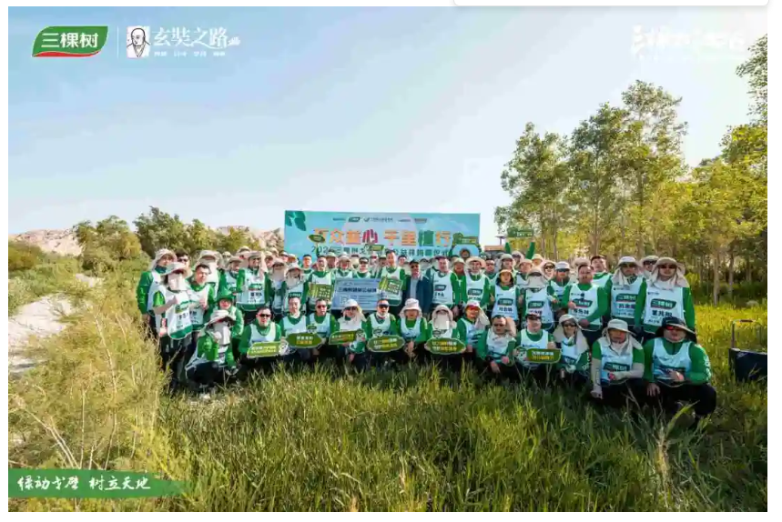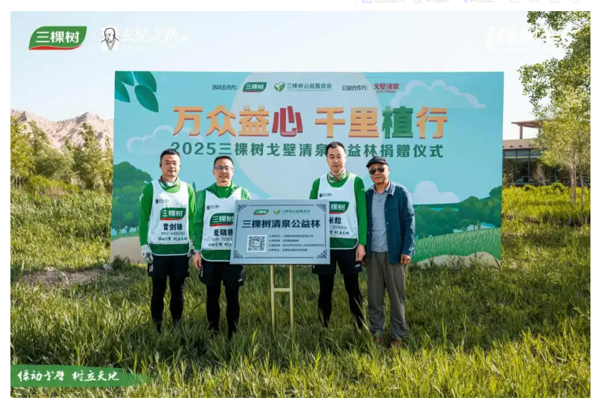 自2019年起,三棵树与戈壁清泉结下深厚情缘,连续五届以实际行动践行公益,持续捐赠并认养清泉公益林,累计种下数百株胡杨树苗。这些胡杨树宛如坚韧的守护者,傲然挺立于风沙之中,为戈壁滩增添一抹生机与绿意,传递出生命不息、奋斗不止的精神力量,体现了三棵树对环保公益事业的执着追求与不懈努力。