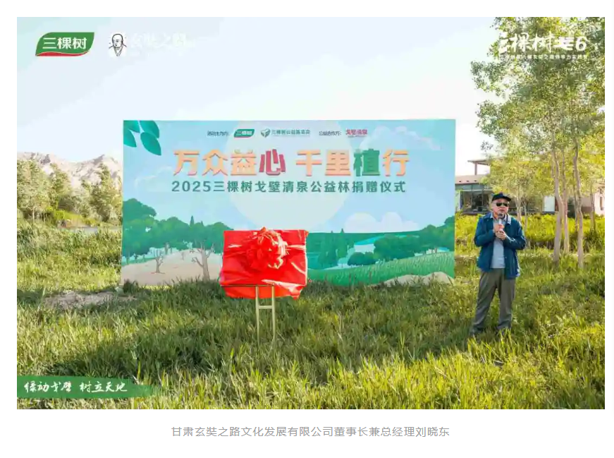 甘肃玄奘之路文化发展有限公司董事长兼总经理刘晓东对三棵树的慷慨捐赠给予了高度赞扬,他强调了戈壁清泉在生态环境保护中的重要作用,并对三棵树多年来的坚守与付出表示衷心感谢。胡杨树在风沙肆虐的戈壁中顽强向上生长,向下扎根,展现出坚韧不拔的生命力,这与三棵树“永远向上”的企业精神高度契合。