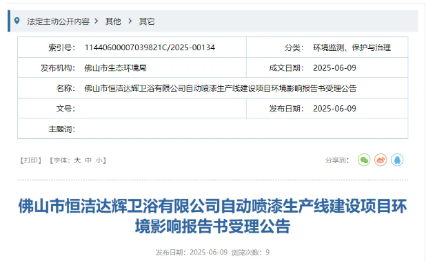 近日,佛山市生态环境局发布佛山市恒洁达辉卫浴有限公司自动喷漆生产线建设项目环境影响报告书受理公告。