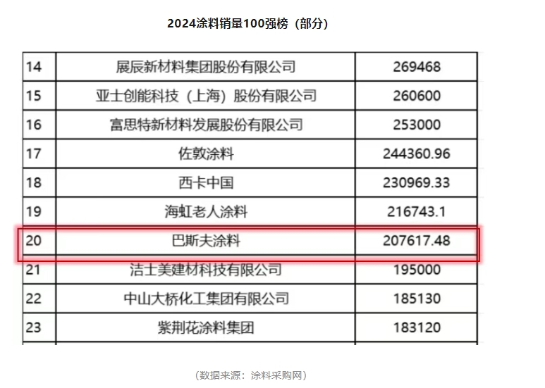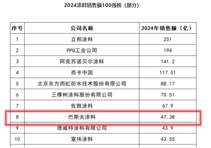 作为涂料领域极具专业性与权威性的新媒体服务平台,涂料采购网近期发布的2024涂料行业“最赚钱”的100家企业和涂料销量100强企业排行榜,引发了行业内外的高度关注。在这两份备受瞩目的榜单中,巴斯夫涂料凭借卓越的市场表现脱颖而出,交出了一份令人瞩目的成绩单:以47.38亿元的销售额与21.67万吨的销售量,同时强势跻身第8位与第20位,彰显出其在涂料行业强大的综合实力与市场竞争力。