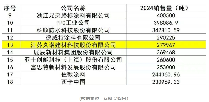 而市场对于优质创新产品的反馈,往往最能说明其价值与潜力。近日,作为涂料领域极具专业性与权威性的新媒体服务平台,涂料采购网近期发布的2024涂料销量100强企业排行榜,引发了行业内外的高度关注。久诺以27.99万吨的骄人销售业绩强势上榜,位列第14名。在数据与实力的双重见证下,久诺的“超耐久”能否成为改写行业未来的关键力量?
