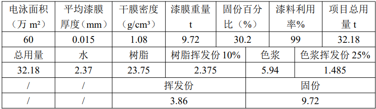 电泳漆用量核算:项目沙发骨架需进行电泳工艺,根据建设单位资料, 单件工件电泳面积约为4m²,沙发骨架年用量为15 万套,总电泳面积为60万 m²,约有1%的不合格工件重新电泳涂装,每个工件厚度为15μm,使用 电泳漆配比为水:树脂:色浆:助剂=10:100:25:0.5(质量比)。