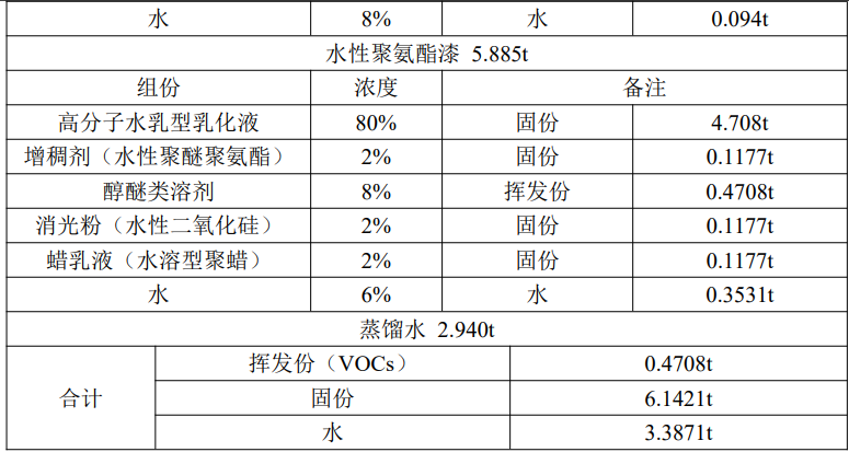 水性漆:以水为溶剂或以水为分散介质的涂料,不含有机溶剂,无毒无 刺激气味,对人体无害,根据使用需求具有漆膜丰满、晶莹透亮、柔韧性好、 耐水、耐磨、耐老化、耐黄变、干燥快、使用方便等特点,项目使用水性漆 为水性聚氨酯涂料。