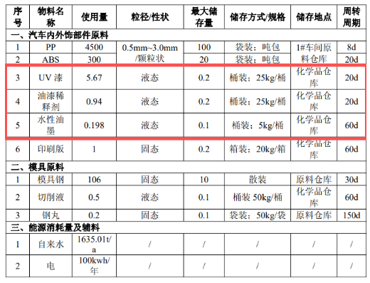 UV漆:项目油漆为UV漆;外观为粘稠性液体;具有刺激性气味;油漆密度为1.25g/cm3;主要成分为:聚酯丙烯酸酯80%~95%;二缩三丙二醇二丙烯酯(TPGDA)1%~5%;三羥甲基丙烷三丙烯酸酯(TMPTA)1%~5%;光引发剂0%~5%。不溶于水,可与丙酮、醋酸正丁酯等酮和酯类溶剂混溶。