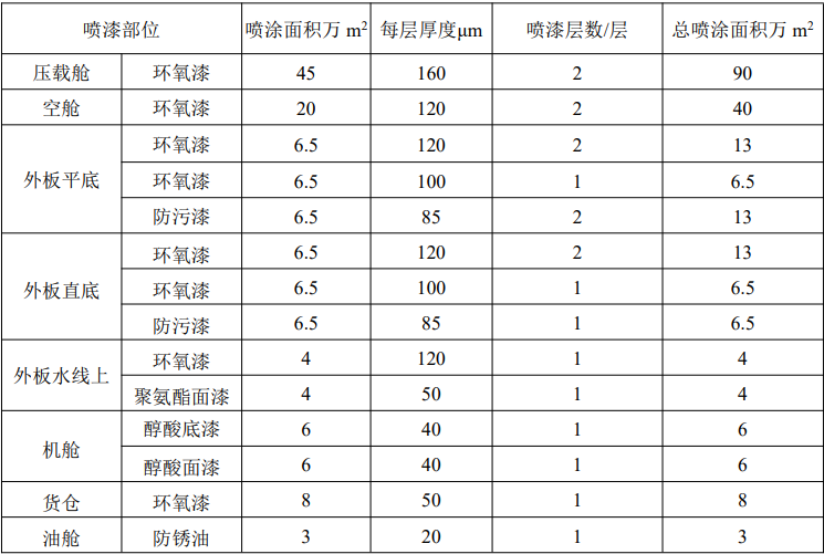 根据上式计算,油漆理论使用量(包含稀释剂、固化剂等)分别为环漆788.726t/a、防污漆59.305ta、聚氨酯面漆5.788ta、醇酸底漆9.314ta、醇酸面漆8.210ta、防锈油1.382t/a,根据现有工程生产经验,企业提供油漆用量分别为环氧漆794.712ta、防污漆59.790ta、聚氨酯面漆5.914ta、醇酸底漆10.049ta、醇酸面漆8.709ta、防锈油1.446t/a,本次环评采用企业提供的油漆等用量。