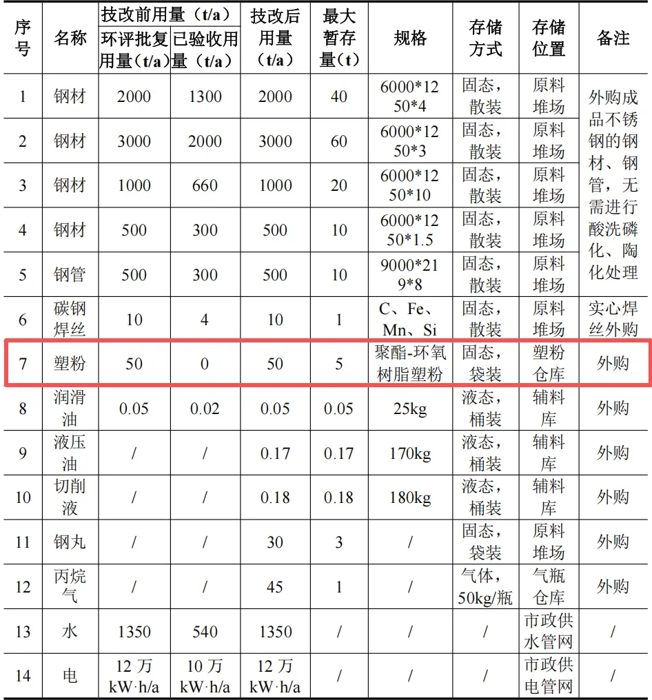 本项目原辅材料主要为钢材、钢管、碳钢焊丝、塑粉等,原项目于2022年9月通过“快递物流机电设备制造二期项目”(阶段性)竣工环境保护验收,喷粉柜和烘箱暂未建设,技改后,机加工工段新增抛丸工序,喷粉线的喷粉柜改为静电粉末自动喷粉房,烘箱(电加热)改为热风式固化烘道(以丙烷气为燃料)。