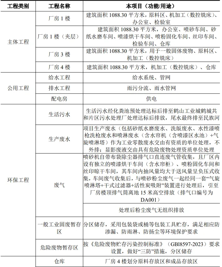 项目位于鹤山市鹤城镇鹤山工业城B区2号地块1期11#号楼1-3层,厂房共3层(层高为8米、4.5米和4.5米,其中1楼层高为8米,建设单位将1楼划分为1楼和1楼夹层),项目建筑面积3264.91平方米,组成包括主体工程、辅助工程、公用工程、环保工程、储运 工程、依托工程。