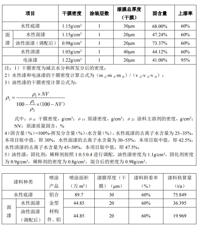 油漆用量核算 根据建设单位提供资料,项目需喷漆产品为89.700万m2、喷粉产品为669.874万m2、电泳产品为311.206万m2.根据建设单位提供资料,本项目水性底漆、面漆、清漆和电泳漆均无需调配 使用。油性面漆需要调配后使用,油性漆:固化剂:稀释剂的比例为1:0.5:0.4. 本项目喷漆产品涂装为1层底漆+1层面漆+1层清漆,底漆漆层厚度为15μm、 面漆漆层厚度为20μm、清漆漆层厚度为30μm;电泳漆1层,漆层厚度为20μm。