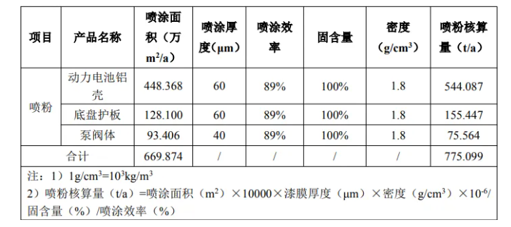 喷粉用量核算本项目参考《喷漆工序有机废气源强的估算比较》静电喷粉设计的一次上粉率为70%(行 业均值),并配置了两级回收粉末设施。第一级旋风风离预计分离约80%大颗粒粉末,这些粉末回收到供粉系统中回用;第二级滤芯过滤约95%细颗粒粉尘,则不再回用(因为细粉粒径较小,影响涂层厚度和上粉率)。按照上述上粉率和回 收率,多次回用后可计算出综合附着率为 89%。