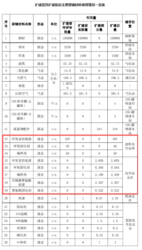 本扩建项目的LNG罐喷漆、酸洗磷化线车间、占地面积1378m2.一栋1层,层高12米。扩建后全厂露天钢材堆场21060m2.分段堆场露天10780m2.机加工车间17500m2.焊接车间21660m2.机加工车间和焊接车间一栋1层,层高20m。 装焊车间15120m2.一栋1层,层高25m。 打砂车间3120m2.一栋1层,层高12m。 涂装车间2230m2.一栋1层,层高12m。预留厂房(电梯分厂未上)总占地面积51252m2.LNG罐喷漆、酸洗磷化线车间1378m2.一栋1层,层高12m。年产15艘5万吨级船舶的分段,年产LNG单耳罐4个、双耳罐 3个(公司内部生产使用)