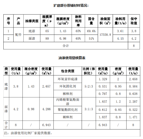 底漆VOCs含量计算:根据附件环氧富锌底漆、环氧固化剂、稀释剂的MSDS 报告,挥发份为正丁醇、二甲苯;挥发量为10%、环氧固化剂挥发量为50%、稀释剂挥发量100%。施工配比的VOCs含量为(5×2×10%+2×0.95×50%+3×0.8×100%)÷10=435g/L。同理面漆 VOCs含量480.7g/L。