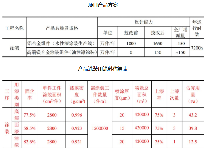 建设单位对现有水性漆涂装生产线进行技术改造,改造完成后将水性漆替换使用高端功能性涂料(油性漆)以提升产品性能。技术改造后全厂将减少水性涂装的镁合金组件150万件/年(全厂现有水性漆涂装的镁合金组件约1800万件/年),新增由高端功能性涂料(油性漆)涂装的高端镁合金涂装组件150万件/年,建设单位其他产品生产不受影响。