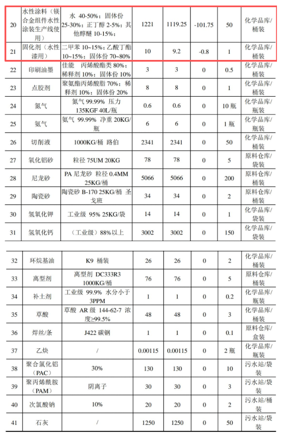 本项目的建设将减少全厂镁合金组件水性涂料用量约101.75t/a,减少镁合金组件水性涂料固化剂用量约0.8t/a。