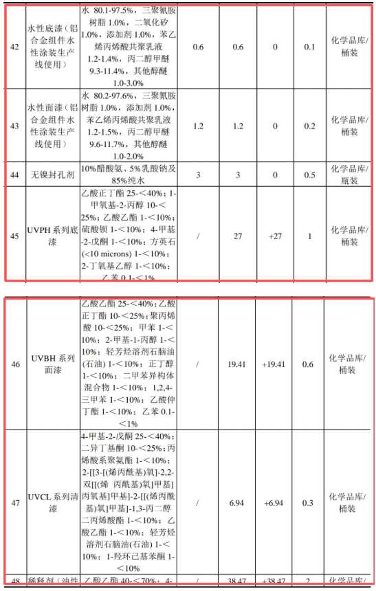 本次技改项目使用具有阻燃抗指纹功能的特殊功能性涂料对镁合金组件进行涂装生产,由于产品漆膜外观不同,使用的涂料漆包含三大系列产品(UVPH系列底漆、UVBH系列面漆和UVCL系列清漆),采用相同的稀释剂、固化剂按比例对各涂料进行调配后方可用于涂装。