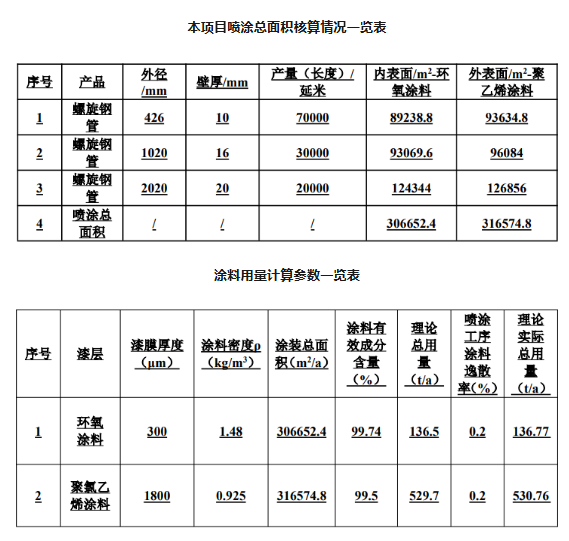根据上表可知,环氧涂料、聚乙烯涂料理论总用量分别为136.5t/a、529.7t/a,又喷涂环节为密闭负压状态,产生的颗粒物通过收集后,引入脉冲袋式除尘器进行 收尘,收集后的涂料,又会回用于生产。根据项目源强核算,涂料的逸散率为0.2%, 则项目环氧涂料、聚乙烯涂料理论实际总用量分别为136.77t/a、530.76t/a。 建设单位提供的环氧涂料、聚乙烯涂料使用量分别为137t/a、532t/a,与计算所 得环氧涂料、聚乙烯涂料理论实际总用量差别不大。项目考虑到其他物料损失环节,如粉料的撒、漏,本次评价采用建设单位提供的涂料使用量数据进行评价。