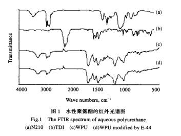 图 1 为聚醚二醇 、T D I 及改性水性 聚氨酯树脂的红外光谱 图。图中谱线(a)为聚醚二醇的谱 图,3528cm 为羟基特征峰 ;(b)为 TD I 的 F FIR 谱图峰 ;(C)为水性 聚氨酯的 F FIR 谱 图,谱 图 中3528cm 的羟基 峰 和 2280~2270 cm 处 的 N C O基 峰 消失 ,在 3334 cm 和 1560~1537cm 处出现 N —H 的特征吸收峰 ,表明 N C O 基与羟基 全部 反应 生 成 氨基 甲酸 酯基 , 1620~1560cm 为羧酸盐 的特征峰 。(d)为环氧改性水性聚氨酯 ,与(c)曲线相比,在 1300cm 处有环氧树 脂 季碳 原 子 的 特征 峰 ,环 氧基 的特 征 峰(910cm )消失 ,在 3500 cm 处 的羟 基特征 峰消失。红外光谱分析表明环氧树脂的羟基和环氧基全部参与反应生成了环氧改性的阴离子水性聚氨酯结构 。