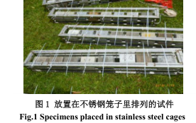 (3)将所有试件(饱和氢氧化钙溶液组除外)逐个安装在不锈钢笼子里,试件之间用焊接的支杆隔开,试件之间的间距为 5~8cm,试件排列的原则是不同涂层的试件排列在一个笼子里,同一种涂料的 6 个试件分别排列在不同笼子里的顶端、中端和底端(图 1)。这样可以避免笼子在江中的不同位置以及试件在江中的不同深度对淡水壳菜附着的影响。试件浸泡的地点为淡水壳菜广泛分布的东江支流西枝江,将所有笼子沿着西枝江左岸的浆砌石护坡吊入江水中浸泡。