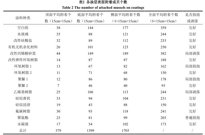 (4)浸泡 9 个月后取出所有试件,逐一观察每个试件上附着的淡水壳菜数量,每个试件按照顶面(距离水面最近)、底面(距离水面最远)和侧面(4 个面总和)的顺序分别进行统计,每一部位都取 6 个试件的平均值作为该种涂料对应部位的代表值,同时观察防附涂层的完整性,记录是否有起鼓或剥落的情况,作为耐久性的考核指标。然后将每个试件表面上的淡水壳菜以及附着的泥沙用采样铲刮下。