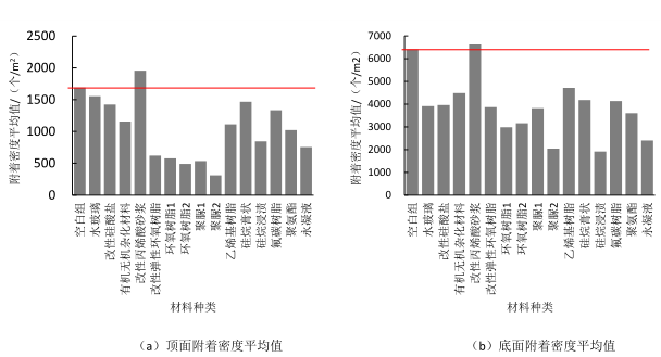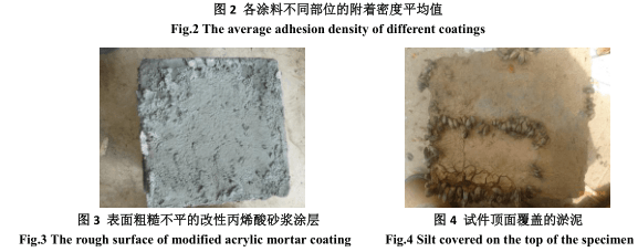 空白和带涂层试件上的淡水壳菜的附着个数见表 2 所示。附着个数除以附着面积即可得到平均附着密度,各涂料不同部位的平均附着密度如图 2 所示,除改性丙烯酸砂浆外(由于施工工艺的原因导致涂层表面粗糙不平,图 3),其余涂料的附着密度均低于空白组,说明其余涂料确实有效降低了淡水壳菜的附着。从各涂料顶面附着密度平均值来看,空白组的附着密度为 1689 个/m 2 ,防附着效果排在前列的几种材料(低于空白组附着密度的 50%)分别是聚脲 2、环氧树脂 2、聚脲 1、环氧树脂 1、改性弹性环氧树脂、永凝液和硅烷浸渍,其中聚脲 2 的附着密度是空白组的 18%(图 2 a);从各涂料底面附着密度平均值来看,空白组的附着密度为 6400 个/m 2 ,防附着效果排在前列的几种材料(低于空白组附着密度的50%)分别是硅烷浸渍、聚脲 2、永凝液、环氧树脂 1和环氧树脂 2,其中硅烷浸渍的附着密度是空白组的 37%(图 2 b);从各涂料侧面附着密度平均值来看,空白组的附着密度为 1967 个/m 2 ,防附着效果排在前列的几种材料(低于空白组附着密度的 50%)分别是聚脲 2、环氧树脂 2、聚脲 1、环氧树脂 1、改性弹性环氧树脂和硅烷浸渍,其中聚脲 2 的附着密度是空白组的 23%(图 2 c);从各涂料全面附着密度平均值来看,空白组的附着密度为 2659 个/m 2 ,防附着效果排在前列的几种材料(低于空白组附着密度的 50%)分别是聚脲 2、环氧树脂 2、环氧树脂 1、硅烷浸渍、永凝液和聚脲 1,其中聚脲 2 的附着密度是空白组的26%(图 2 d)。综上所述,在试件各部位均附着较少的涂料有聚脲 2、环氧树脂 2、环氧树脂 1和硅烷浸渍。