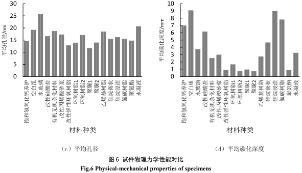 由于表层孔隙特征受取样随机性的影响较大,抗压强度受涂刷龄期的影响较大,因此主要从抗碳化性来评判各涂层抗侵蚀性的优劣,但聚氨酯和聚脲 1 在浸泡一段时间后会产生鼓泡等现象,影响耐久性,因此从抗侵蚀性和耐久性综合来看,聚脲 2、环氧树脂 2 和改性弹性环氧树脂是较优的涂料。