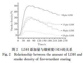 由图2可知,未加入LDH的阻燃涂料在燃烧60s处最大烟密度高达50%左右,而加入不同份数的LDH后,阻燃涂料产生烟雾的时间不同程度的推迟,并且生烟总量都有降低。加入12份LDH涂料烟密度降低至不到30%;加入25份LDH后,烟密度仅为8%左右。由图3可知,随着 LDH添加量的增加,SDR呈现先降低后增高的趋势。在加入25份水滑石后,SDR由38降低至3.4;LDH为50份时,烟密度等级也仅为4.9。这表明LDH在阻燃涂料中有很好的抑烟效果。